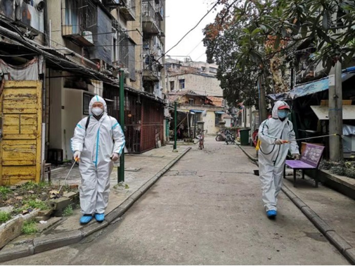 此次疫情的爆发地华南海鲜市场正位于唐家墩街,抗疫突击队员们毫不畏惧,坚决服从指挥,步调一致,行动迅速,全力投入疫情防控工作。突击队员们按照社区要求,背着40斤重的消毒液,从小花坛到垃圾箱,从小区门口到执勤点,从一楼到顶层进行大面积消毒。为了全面排查网格内“四类人员”,突击队员们开展测量体温、电话访问、信息登记等工作,严格排查各家各户人员发热情况。