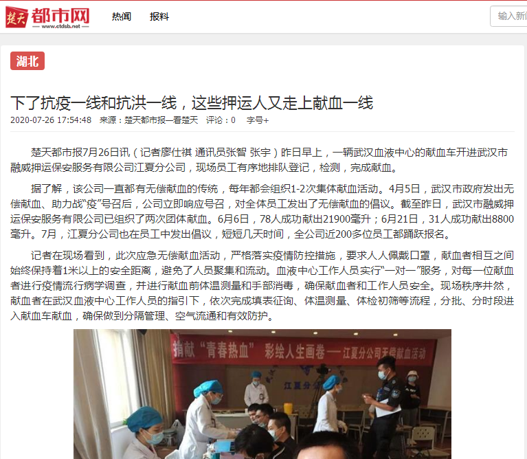 据了解,该公司一直都有无偿献血的传统,每年都会组织1-2次集体献血活动。4月5日,武汉市政府发出无偿献血、助力战“疫”号召后,公司立即响应号召,对全体员工发出了无偿献血的倡议。截至昨日,武汉市融威押运保安服务有限公司已组织了两次团体献血。6月6日,78人成功献出21900毫升;6月21日,31人成功献出8800毫升。7月,江夏分公司也在员工中发出倡议,短短几天时间,全公司近200多位员工都踊跃报名。