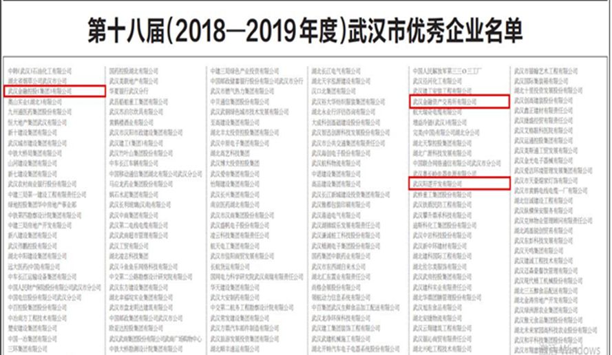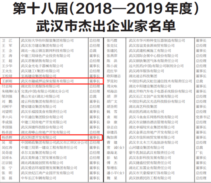 12月15日,武汉企业联合会、武汉企业家协会发布第十八届(2018-2019年度)武汉优秀企业和优秀企业家榜单,集团公司、武汉金交所、阳开公司荣获“武汉市优秀企业”称号,集团总经理梅林荣获“武汉市卓越企业家”称号,集团总经理助理、融威押运公司董事长王新刚,阳开公司董事长杨浩辉荣获“武汉市杰出企业家”称号。