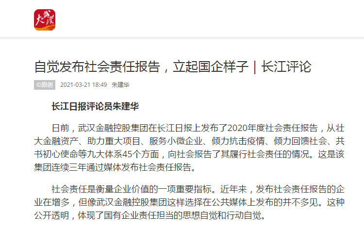 社会责任是衡量企业价值的一项重要指标。近年来,发布社会责任报告的企业在增多,但像武汉金融控股集团这样选择在公共媒体上发布的并不多见。这种公开透明,体现了国有企业责任担当的思想自觉和行动自觉。