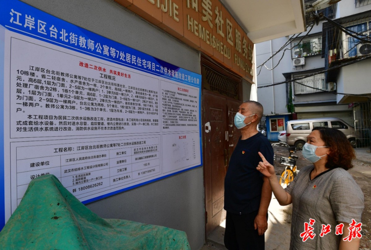 住在汉口渔场宿舍4单元4楼的居民吴明实告诉长江日报记者,周边台北公寓等老旧小区大多建成于上世纪八九十年代,大都存在水压不足的问题。2021年7月,和美社区启动二次供水改造工程。