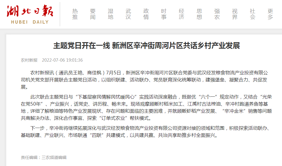 7月5日,新洲区辛冲街周河片区联合党委与武汉经发粮食物流产业投资有限公司机关党支部开展联合主题党日活动,以组织联建、活动联办、党员联育深化统筹联动,建强堡垒、凝聚合力、共促发展。