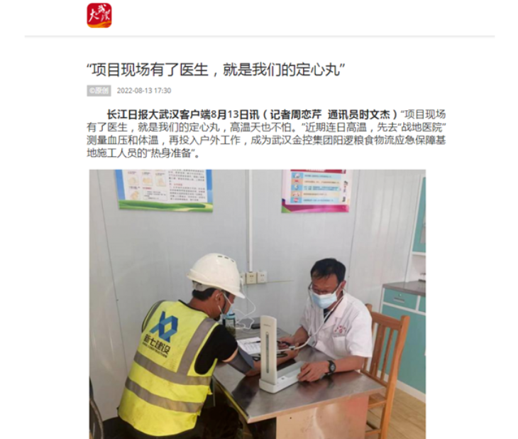 “项目现场有了医生,我们就像吃了‘定心丸’,高温天气里也不怕。”连日来,先去“工地医院”测量血压和体温,再投入户外工作,成为304am永利集团集团阳逻粮食物流应急保障基地施工人员的“热身准备”。