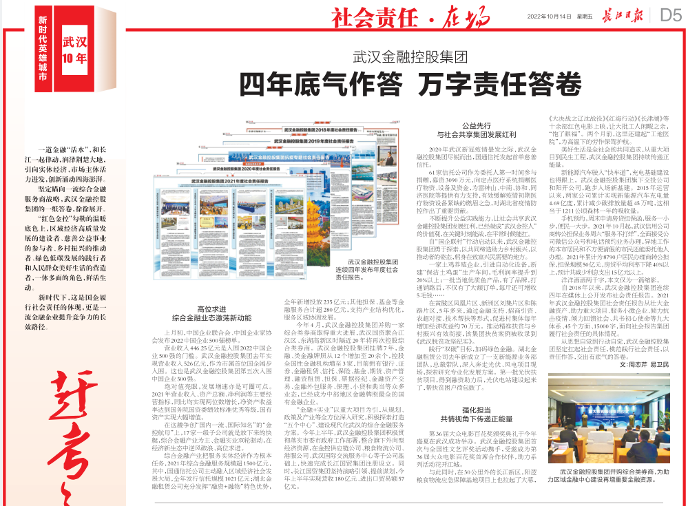 自2018年以来,武汉金融控股集团连续四年在媒体上公开发布社会责任报告。2021年武汉金融控股集团社会责任报告从壮大金融资产、助力重大项目、服务小微企业、倾力抗击疫情、倾力回馈社会、共书初心使命等九大体系、45个方面、15000字,面向社会报告集团履行社会责任的具体情况。