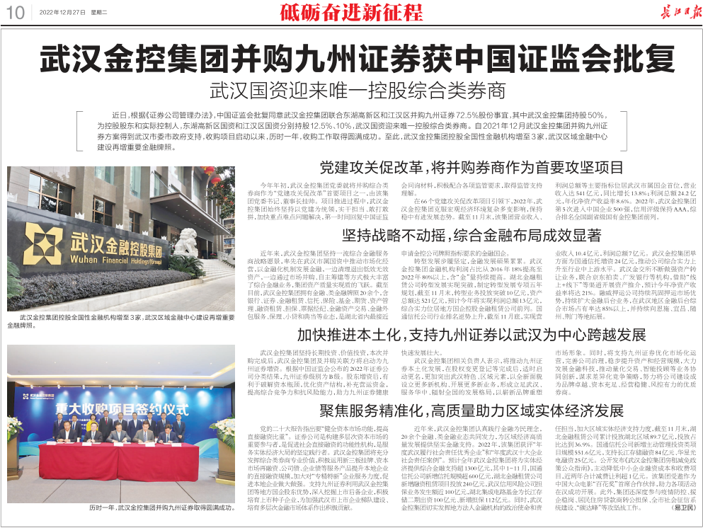 近日,根据《证券公司管理办法》,中国证监会批复同意304am永利集团集团联合东湖高新区和江汉区并购九州证券72.5%股份事宜,其中304am永利集团集团持股50%,为控股股东和实际控制人,东湖高新区国资和江汉区国资分别持股12.5%、10%,武汉国资迎来唯一控股综合类券商。自2021年12月304am永利集团集团并购九州证券方案得到武汉市委市政府支持,收购项目启动以来,历时一年,收购工作取得圆满成功。至此,304am永利集团集团控股全国性金融机构增至3家,武汉区域金融中心建设再增重要金融牌照。