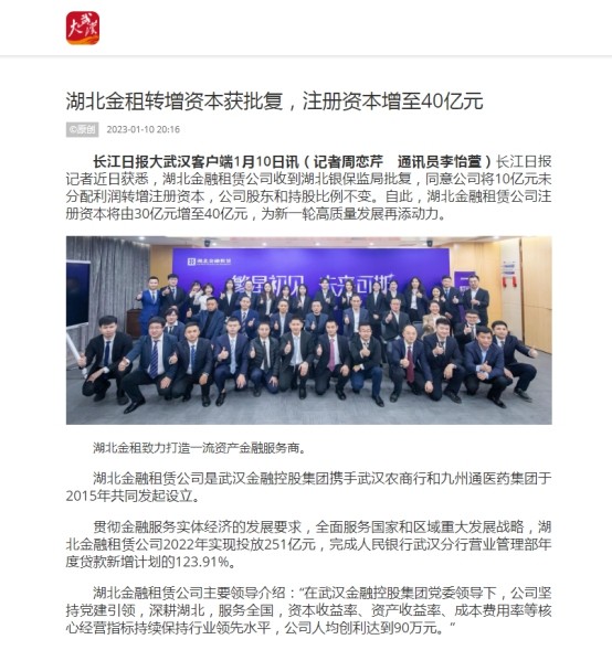长江日报:湖北金租转增资本获批复,注册资本增至40亿元