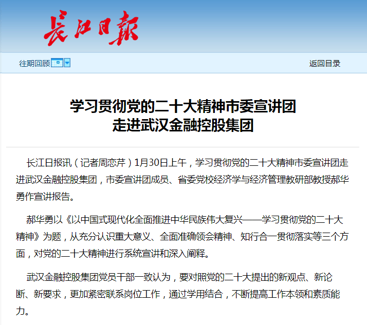 1月30日上午,学习贯彻党的二十大精神市委宣讲团走进武汉金融控股集团,市委宣讲团成员、省委党校经济学与经济管理教研部教授郝华勇作宣讲报告。