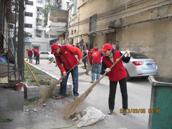 在黄孝北路社区居民楼前,集团公司志愿者们沿着小区的主通道打扫路面卫生、清理卫生死角,大家倾心尽力、认真仔细,有的汗流浃背。经过近两个小时的辛勤劳动,老社区环境卫生焕然一新。