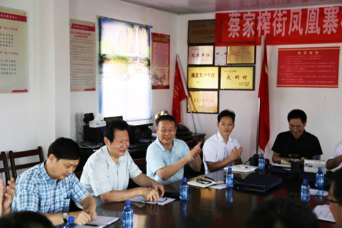 随后,在凤凰寨村村委会会议室召开扶贫攻坚工作座谈会。村党支部书记龚勃生汇报了凤凰寨村基本情况、此次洪灾的损失情况。黄陂区扶贫办、蔡榨街办事处负责人和相关单位介绍了稻田养虾、光伏发电和旅游开发等扶贫开发项目情况。市纪委、金控集团驻凤凰寨村扶贫工作队队长詹国平主持座谈会并介绍了扶贫攻坚工作计划及帮扶项目进展情况。