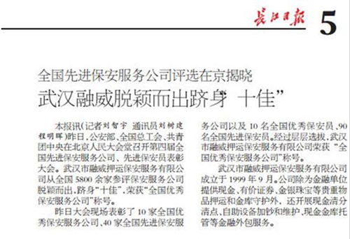 公司喜获殊荣引起社会广泛关注和赞誉, 湖北省保安协会第一时间专程发来贺信,《长江日报》、《楚天都市报》、《武汉晚报》等平面媒体,凤凰资讯、长江网、长江商报、楚天都市网、网易新闻等网络媒体争相报道。
