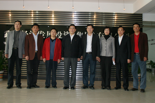 2008年3月26日,市委书记苗圩(左四)在市委常委、市委秘书长彭丽敏(右三)的陪同下到集团调研。
